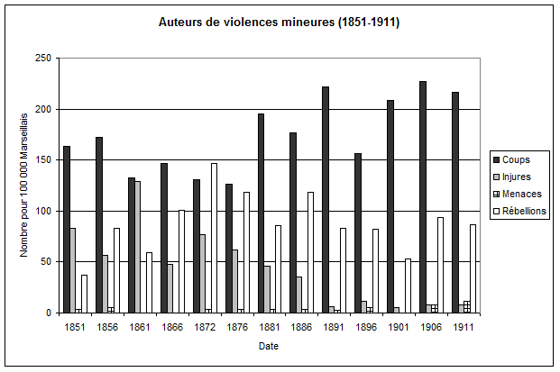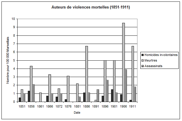 Concernant les auteurs de violences mineures, deux tendances se dégagent. D’une part, la régression du nombre d’individus jugés pour des injures. D’autre part, la progression du nombre d’individus jugés pour des coups. Celle-ci est marquée à partir du début des années 1880. Les deux tendances correspondent à un passage d’une brutalité fortement marquée par l’oralité à une expression corporelle et physique des actes violents [37].Les années 1880 se présentent comme une décennie charnière, où les Marseillais semblent davantage touchés par les violences physiques. Les jugements pour violences mortelles évoluent également de manière remarquable. D’une part, ils sont de plus en plus nombreux pour 100 000 Marseillais. Le tournant à cet égard se situe à nouveau dans les années 1880 : l’année 1886 est marquée par un premier apogée, qui se prolonge jusqu’en 1911. D’autre part, les violences mortelles commises par ces individus prennent à partir des années 1880 un tour de plus en plus impulsif, comme en témoigne le spectaculaire essor des meurtres, c’est-à-dire des homicides volontaires non prémédités.