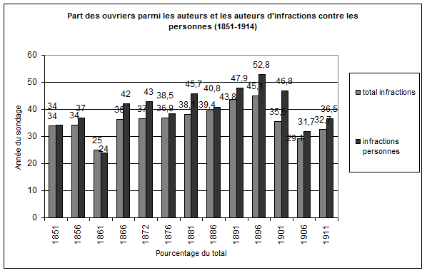 Le graphique ci-dessous compare la part des individus issus du monde ouvrier dans deux groupes de justiciables entre 1851 et 1911. En gris moyen sont représentés les individus jugés pour tous types d’infractions. En noir figurent les individus jugés pour violences :