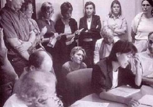 Quelques mois plus tard, le quotidien joint l’image au texte en reproduisant dans son livre de Style, censé établir le « contrat de lecture » entre les lecteurs et les rédacteurs, une photographie de la conférence de rédaction du 11 septembre 2001 [2]. Là encore, le lecteur est plongé dans un univers collectif, sans ordre hiérarchique apparent, débordant le cadre de la pièce :